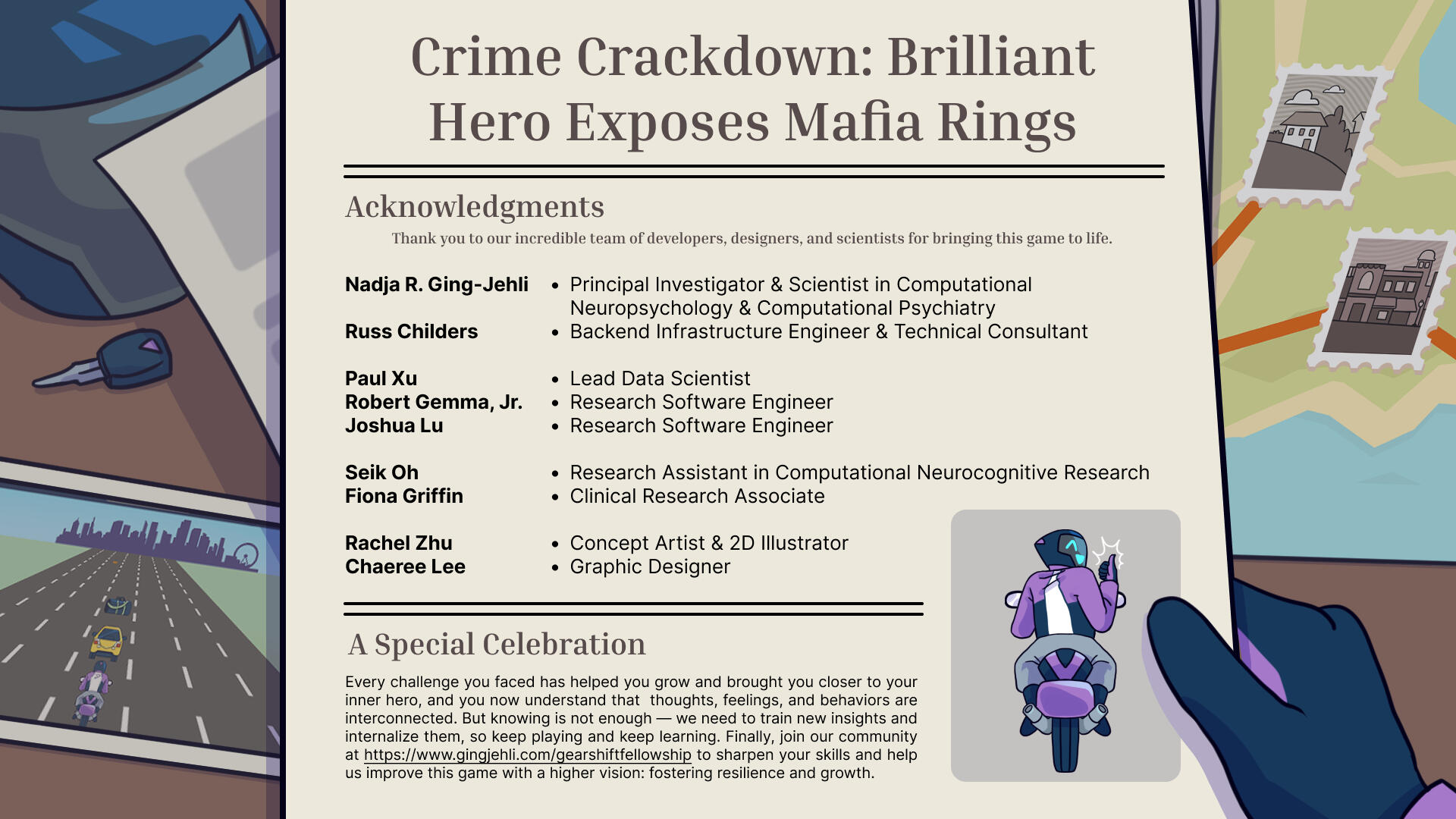 Designed 2D assets, UI, and misc. for a car chase video game that doubles as a psychology study. The game is designed to study behavior in players, and focuses on recognizing and training mindfulness and resilience, especially for those with ADHD, depression, etc. Visually, the game is simple and friendly for the player to have a positive connection with it.Assets designed in Figma, Canva, Adobe Illustrator, and Photoshop for implementation in Javascript